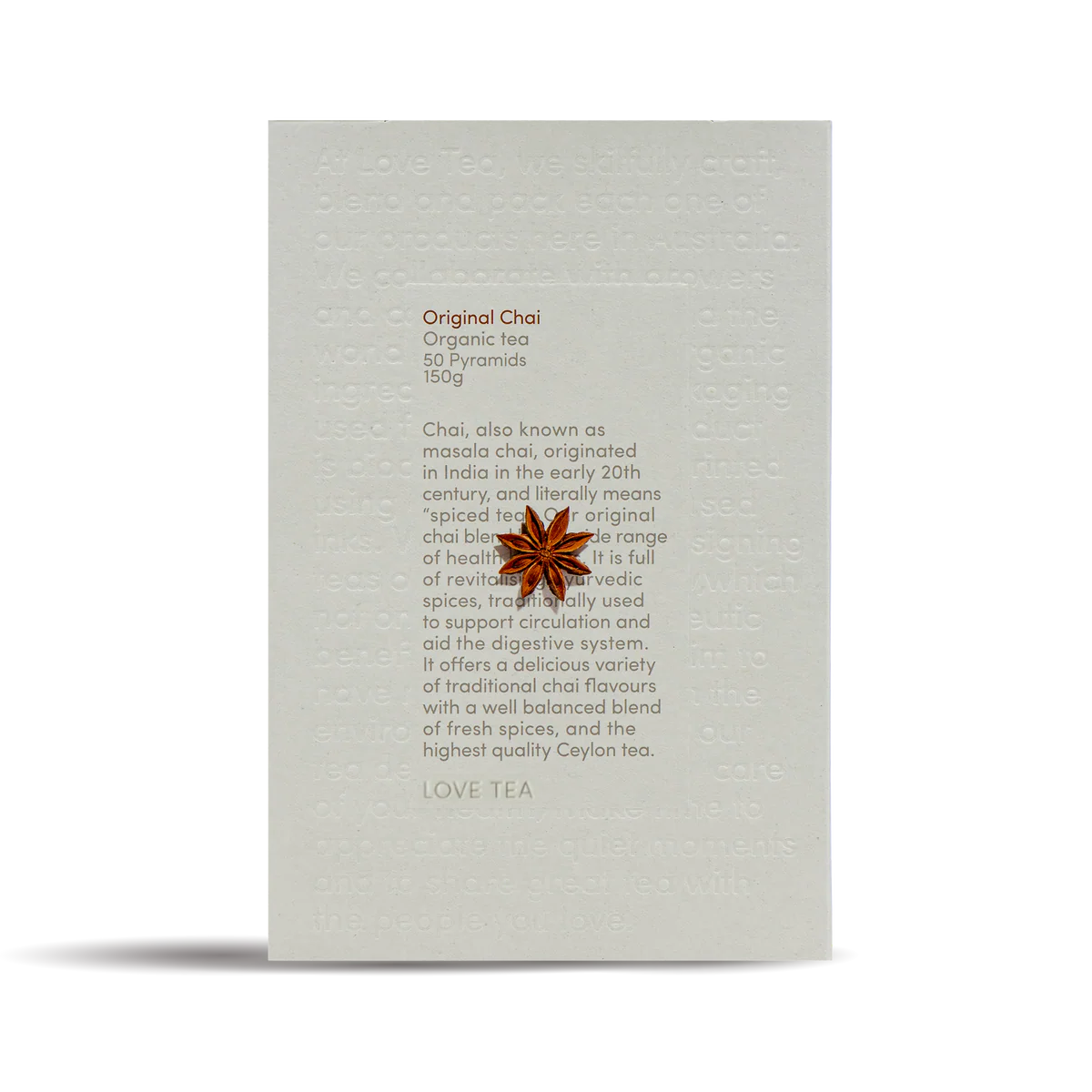 Chai, also known as masala chai, originated in India in the early 20th century, and literally means “spiced tea”. Our original chai blend has a wide range of health benefits. It is full of revitalising ayurvedic spices, traditionally used to support circulation and aid the digestive system. It offers a delicious variety of traditional chai flavours with a well balanced blend of fresh spices, and the highest quality Ceylon tea.