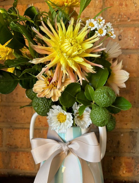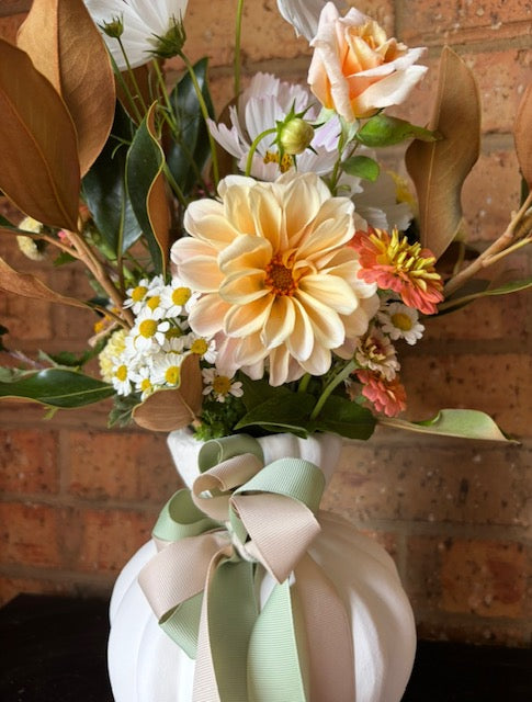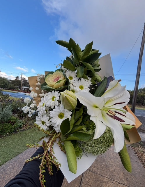 Softly arranged seasonal blooms in calming whites and greens, with the occasional hint of blush, peach or lemon. Presented in a gift box or neutral-toned pot to keep things simple — no need to unwrap, trim or rehome. A thoughtful gesture for when words aren’t quite enough.