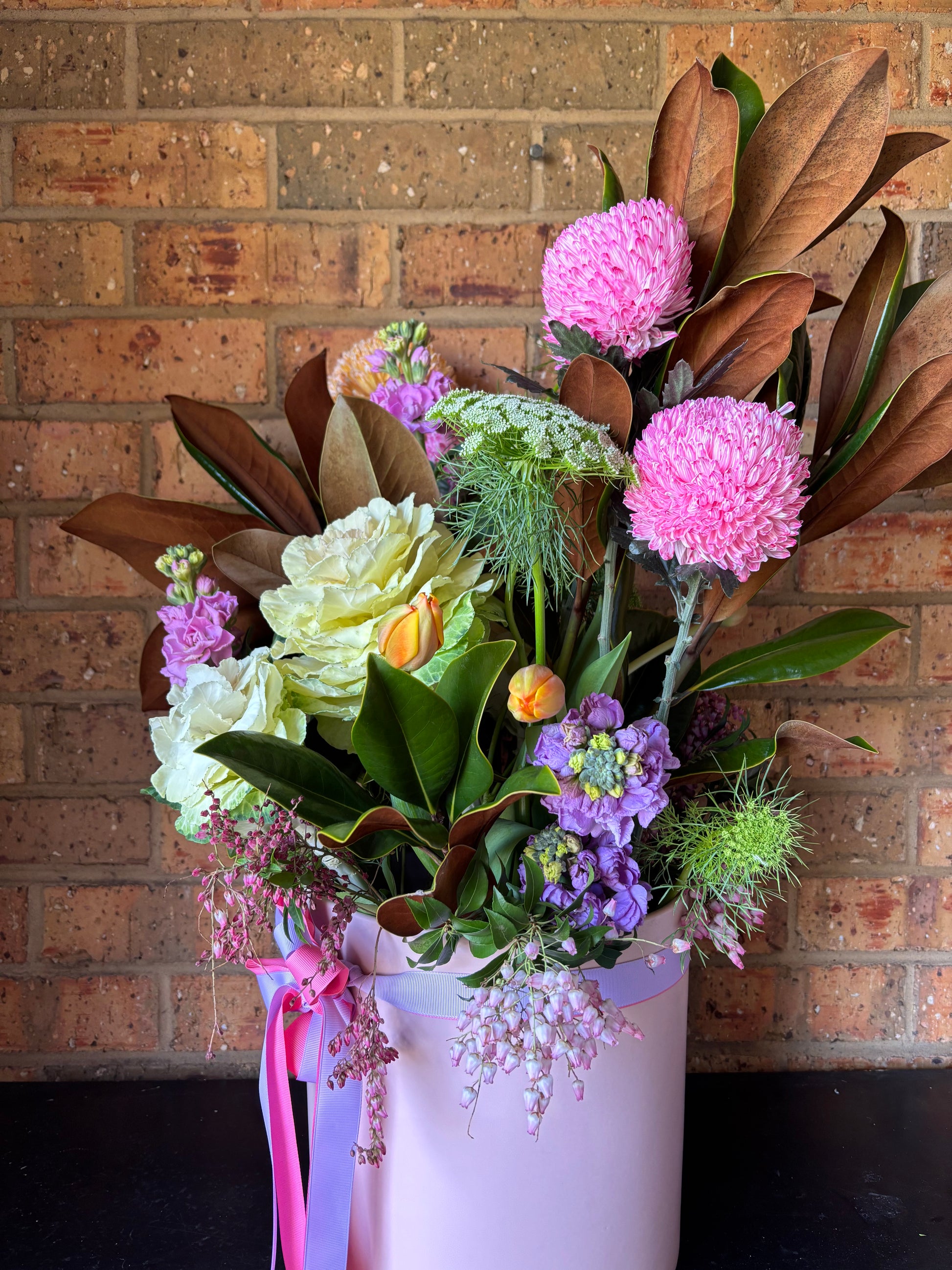 Meet the crown jewel of Lucien Blooms – Queen B. This lush, seasonal arrangement is styled directly into a ceramic or glass vessel, ready to take centre stage.