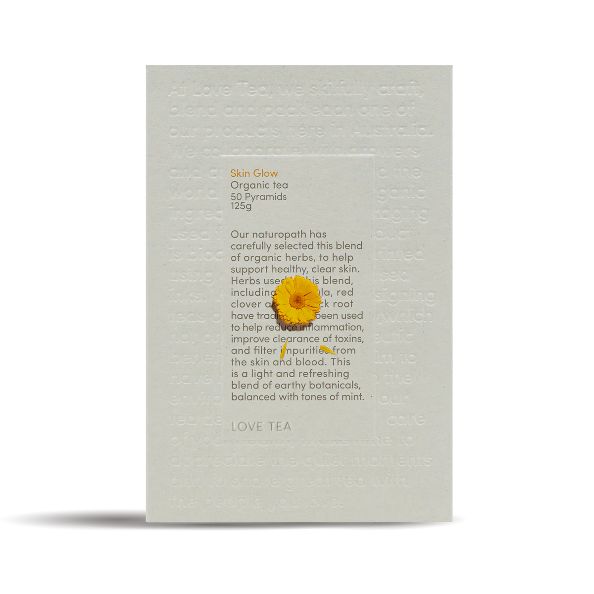 Our naturopath has carefully selected this blend of organic herbs, to help support healthy, clear skin. Herbs used in this blend, including calendula, red clover and burdock root have traditionally been used to help reduce inflammation, improve clearance of toxins, and filter impurities from the skin and blood. This is a light and refreshing blend of earthy botanicals, balanced with tones of mint.